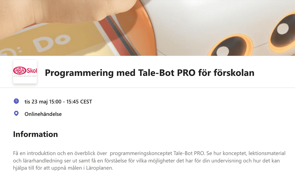 Få en introduktion och en överblick över programmeringskonceptet Tale-Bot PRO. Se hur konceptet, lektionsmaterial och lärarhandledning ser ut samt få en förståelse för vilka möjligheter det har för din undervisning och hur det kan hjälpa till för att uppnå målen i Läroplanen.